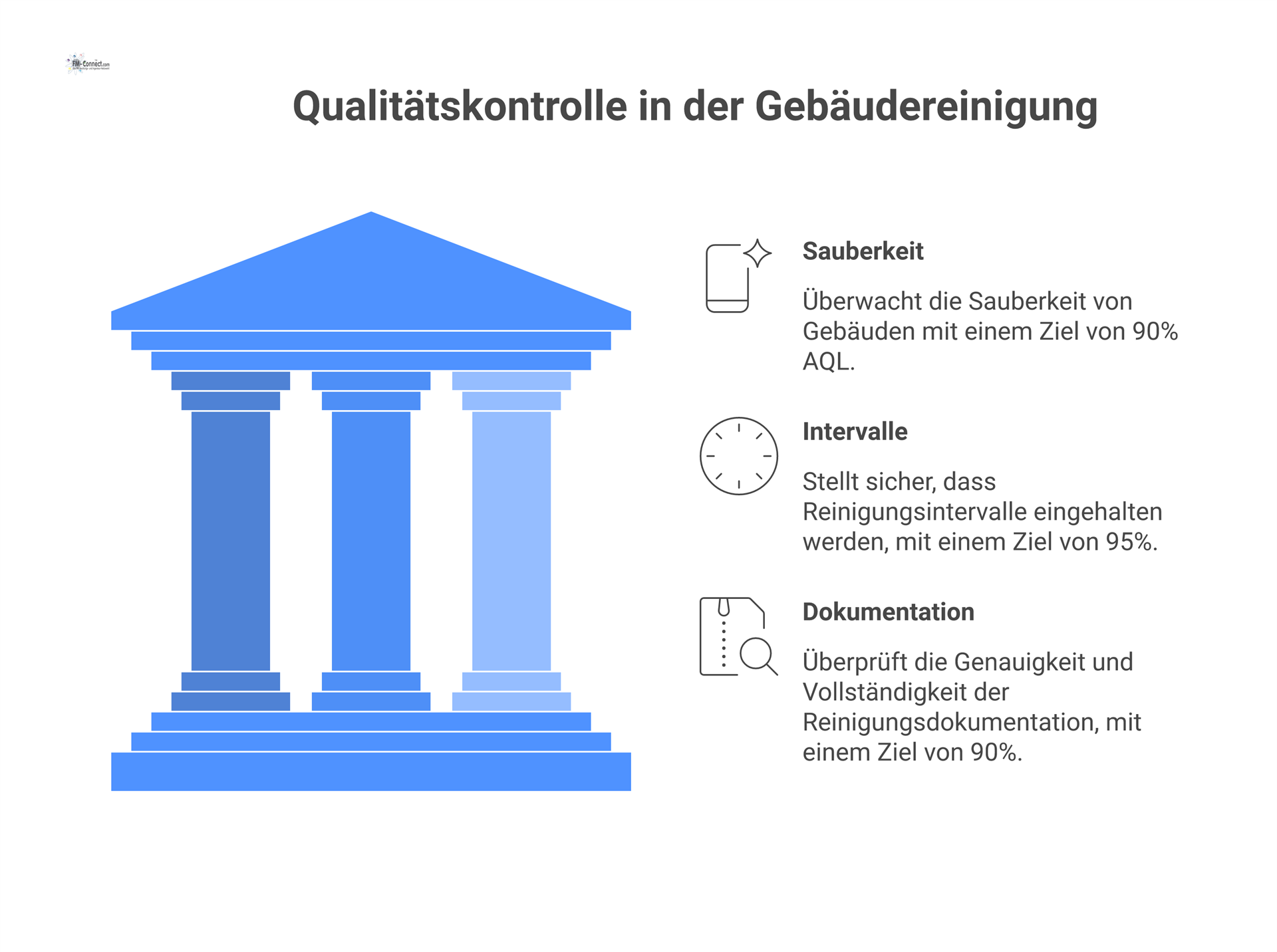 Die Qualität der Reinigung wird oft visuell und stichprobenartig geprüft (z. B. Räume, Flächen). Hier kommen statistische Qualitätsmesssysteme nach DIN ISO 2859 zum Einsatz, um zu entscheiden, ob die Gesamtleistung akzeptabel ist. In der Praxis empfiehlt der Bundesinnungsverband der Gebäudereiniger eine Prüfplanung nach Prüflevel II mit einem AQL von 10 %. Das heißt, es dürfen bei einer Stichprobe bis zu 10 % der inspizierten Bereiche geringe Mängel aufweisen, ohne dass die Gesamtleistung als „nicht bestanden“ gilt. Gravierende Reinigungsmängel (z. B. hygienisch untragbare Zustände) sind hingegen unzulässig. Zudem sollte die Reinigungsleistung vertragsgerecht hinsichtlich Umfang und Häufigkeit erfolgen (kein unangekündigter Ausfall von Reinigungszyklen).