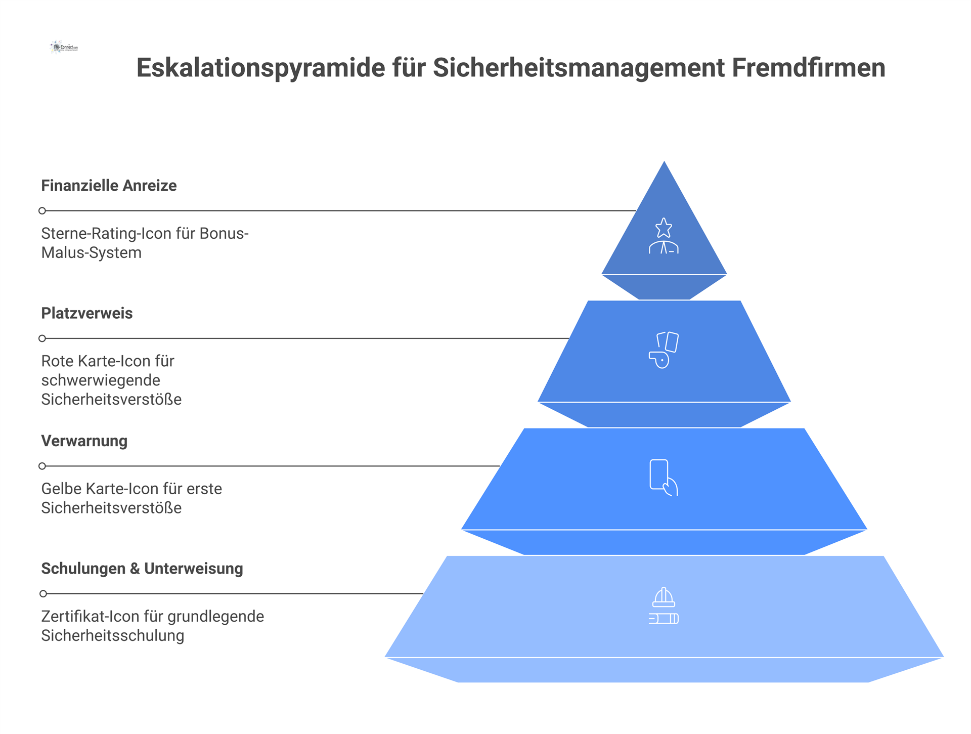Erfahrungsaustausch und Schulungen: Einige Auftraggeber unterstützen ihre Fremdfirmen auch positiv, z.B. durch gemeinsame Sicherheitsschulungen oder jährliche Safety Days, wo Best Practices ausgetauscht werden. Solche Maßnahmen fördern eine partnerschaftliche Präventionskultur. In einem Eskalationsfall (viele Verstöße) kann der Auftragnehmer auch verpflichtet werden, zusätzliche Schulungen durchzuführen oder ein Sicherheitskonzept vorzulegen, bevor er weiterarbeiten darf. Dies stellt ebenfalls eine präventive Sanktionsmaßnahme dar, die auf Verhaltensänderung abzielt statt auf bloße Bestrafung.