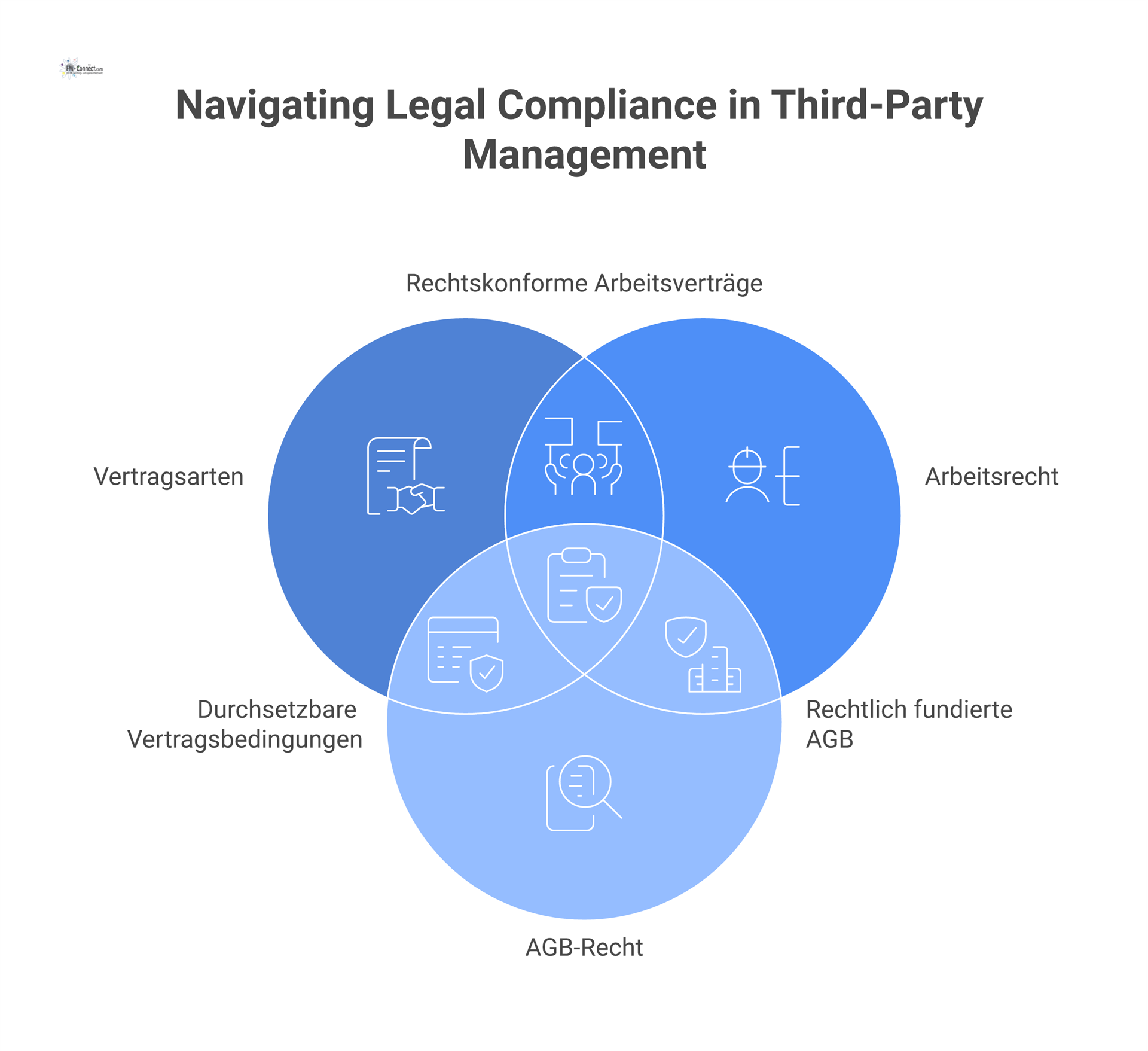 Ein solides Verständnis des rechtlichen Rahmens ist Grundvoraussetzung, um Verträge so zu gestalten, dass Zielgleichheit gefördert wird und nicht durch juristische Fallstricke gefährdet wird. Im Kontext des Fremdfirmenmanagements sind vor allem das Vertragsrecht des Bürgerlichen Gesetzbuchs (BGB) – insbesondere Werkvertrags- und Dienstvertragsrecht – sowie das Recht der Allgemeinen Geschäftsbedingungen (AGB) und (sofern relevant) das Vergaberecht zu beachten. Auch arbeitsrechtliche Fragen (Scheinselbstständigkeit, Arbeitnehmerüberlassung) und haftungsrechtliche Aspekte spielen eine Rolle.