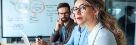 Team analysiert Daten auf interaktivem Bildschirm im Büro.